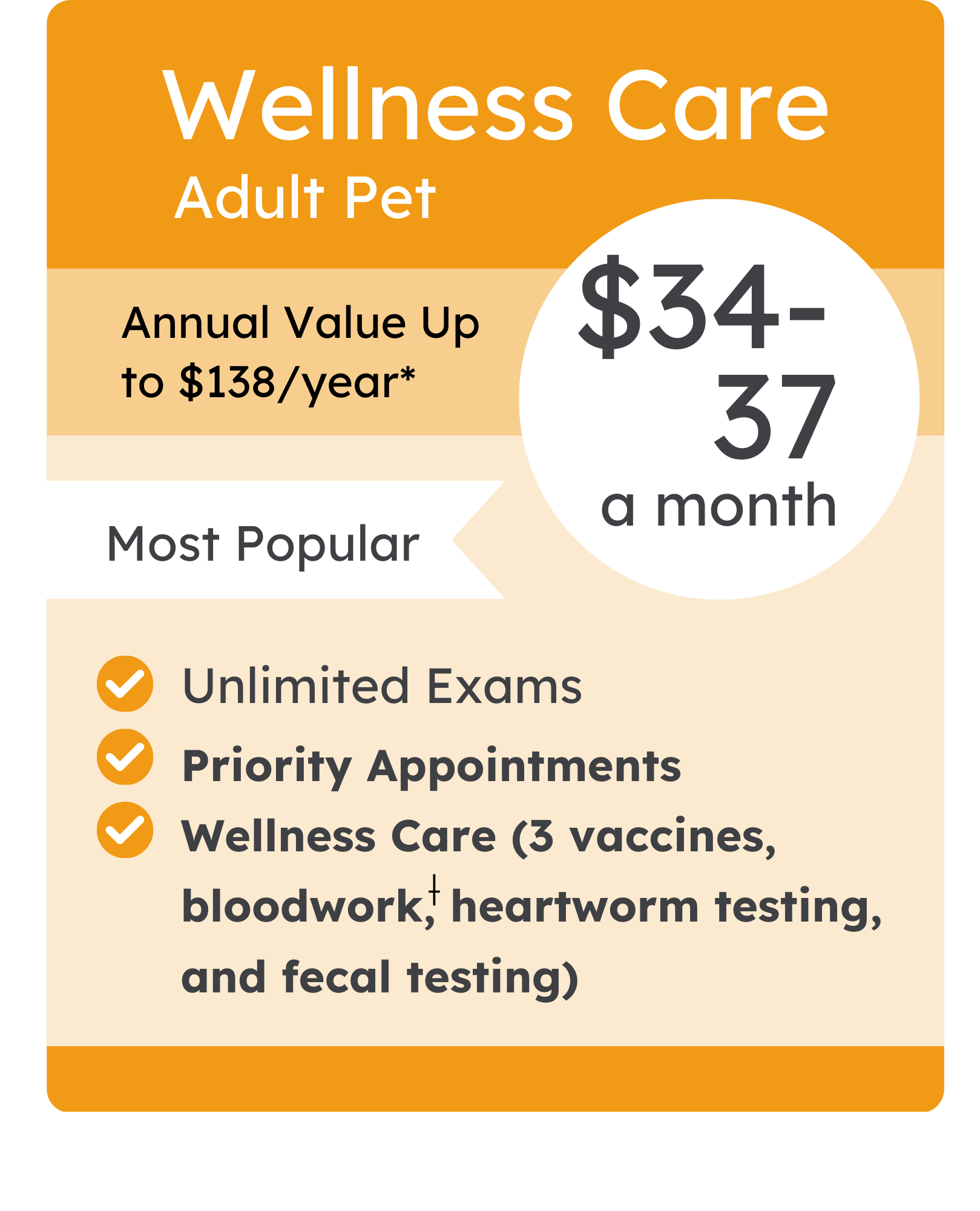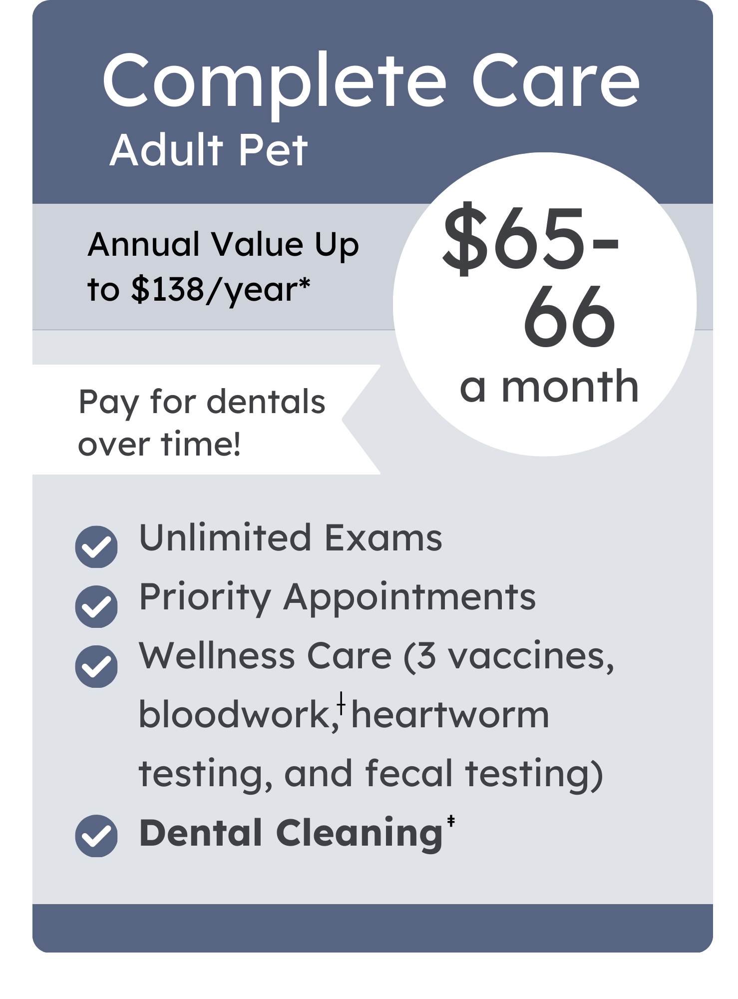 Plus, with our Wellness Care plans, you’ll enjoy priority appointments with same- or next-day scheduling whenever possible. Spread out the cost of services like dental care throughout the year, so you can give your pet the care they need without any financial stress.